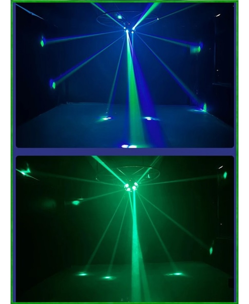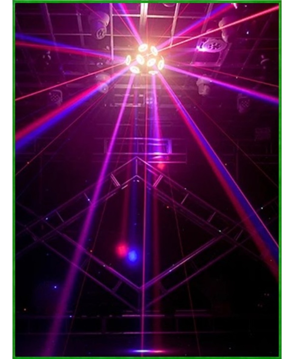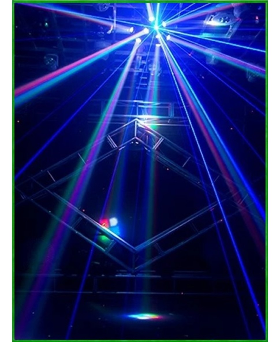 Эта голова вращения порадует яркой палитрой из четырех цветов и трех лазерных вариаций (зеленый/красный/синий).