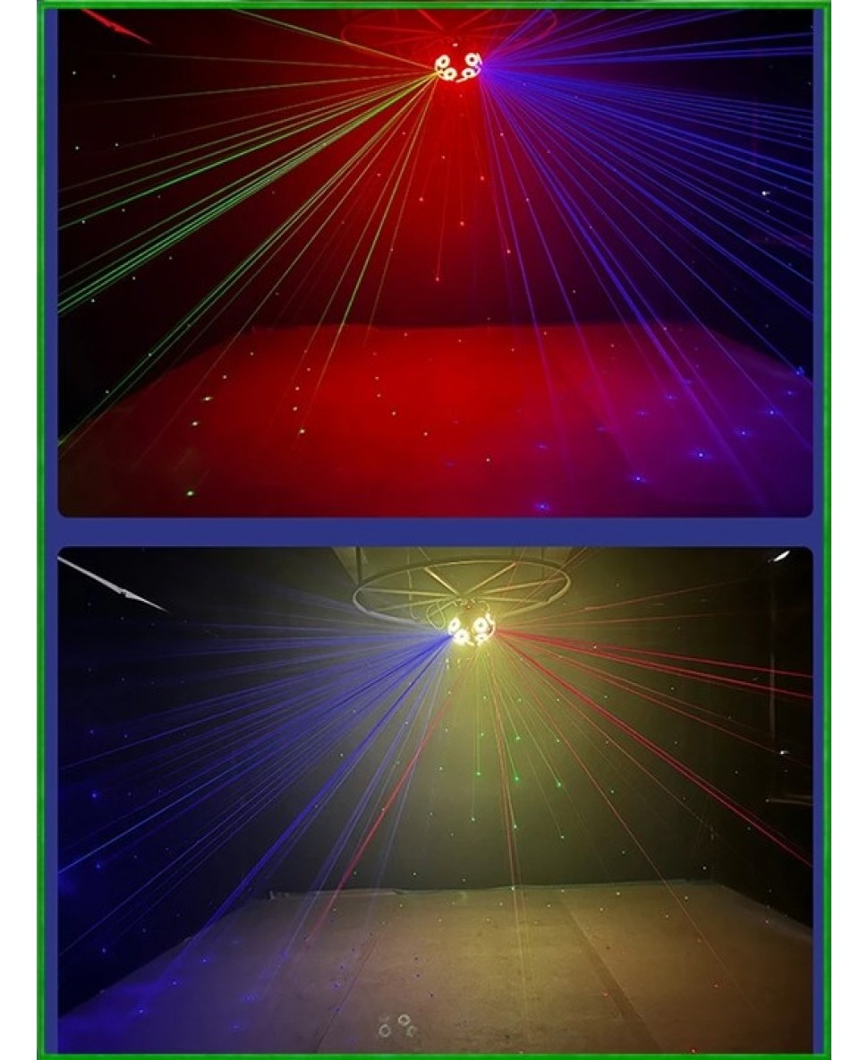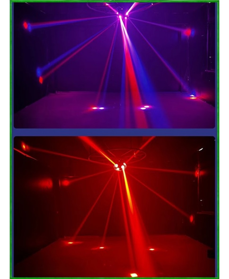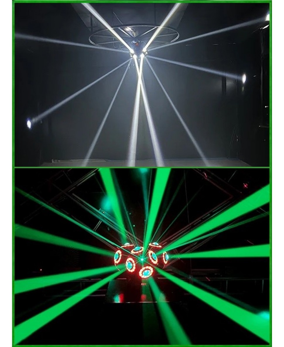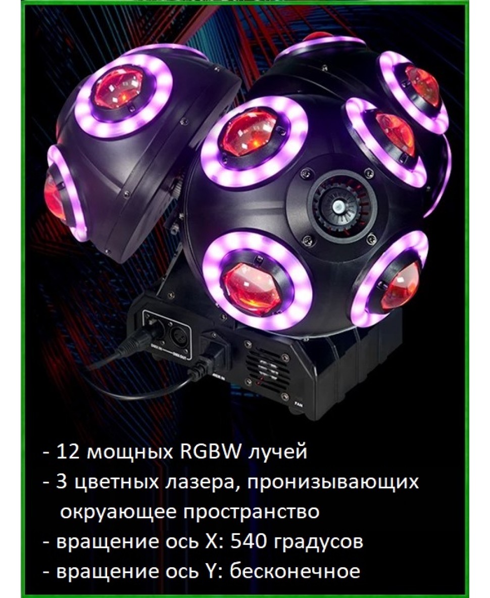 Эта голова вращения порадует яркой палитрой из четырех цветов и трех лазерных вариаций (зеленый/красный/синий).